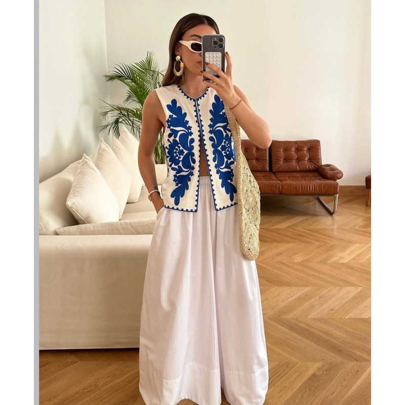 Apportez du renouveau à vos tops les plus basiques avec ce magnifique gilet sans manches . On adore sa broderie florale contrasté devant et au dos.