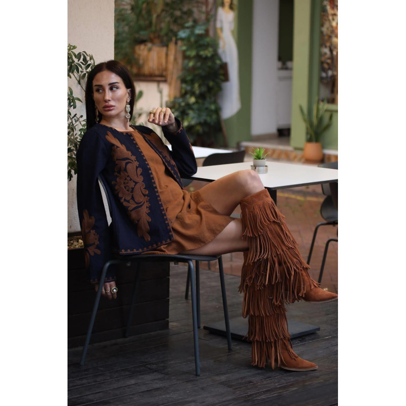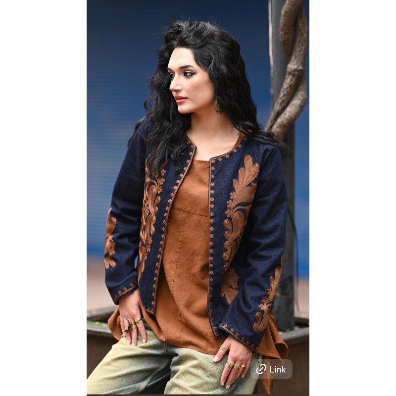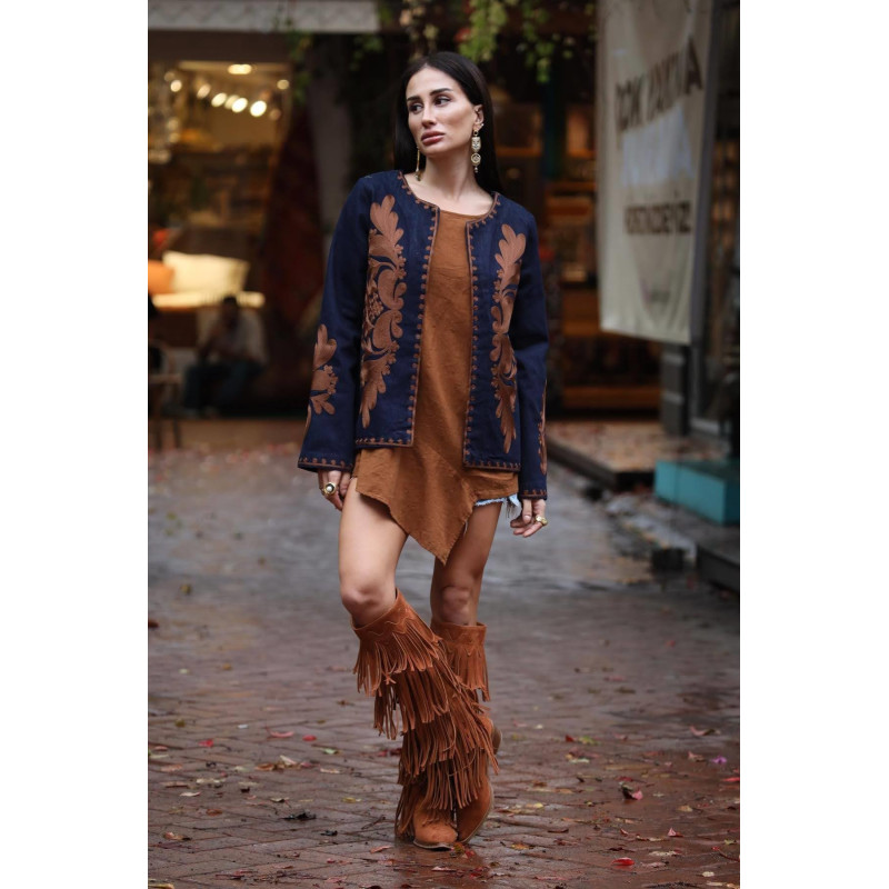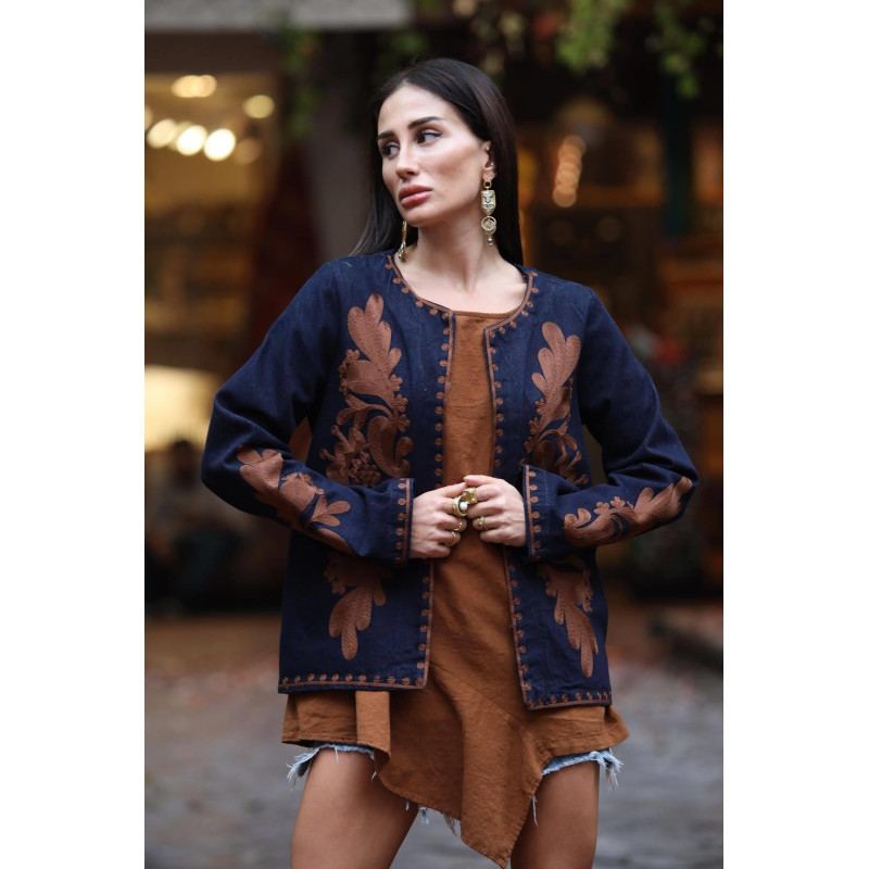 Cette magnifique veste bicolore est l'empreinte de l'esprit bohème que nous aimons tant. On adore sa broderie florale contrastante et sa coupe ouverte facile à superposer.